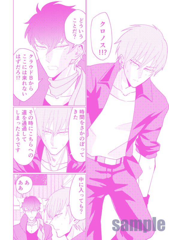 問答無用のラブハメホモSEXが幕を開ける…♡オリジナル漫画『CosmoVirem』(web上ではMode:Comic)の派生作品で、そちらに登場するクロノス(仮)×トーンのR18BL本です。 内容についての説明はサンプル内に記載しています。